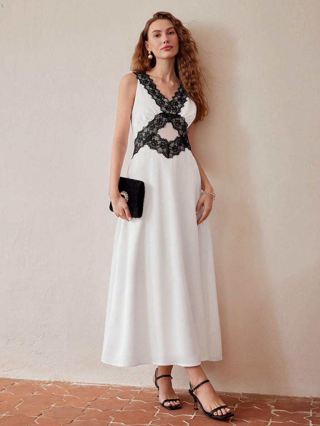 Vestido de encaje con contraste, cuello en V y dobladillo acampanado