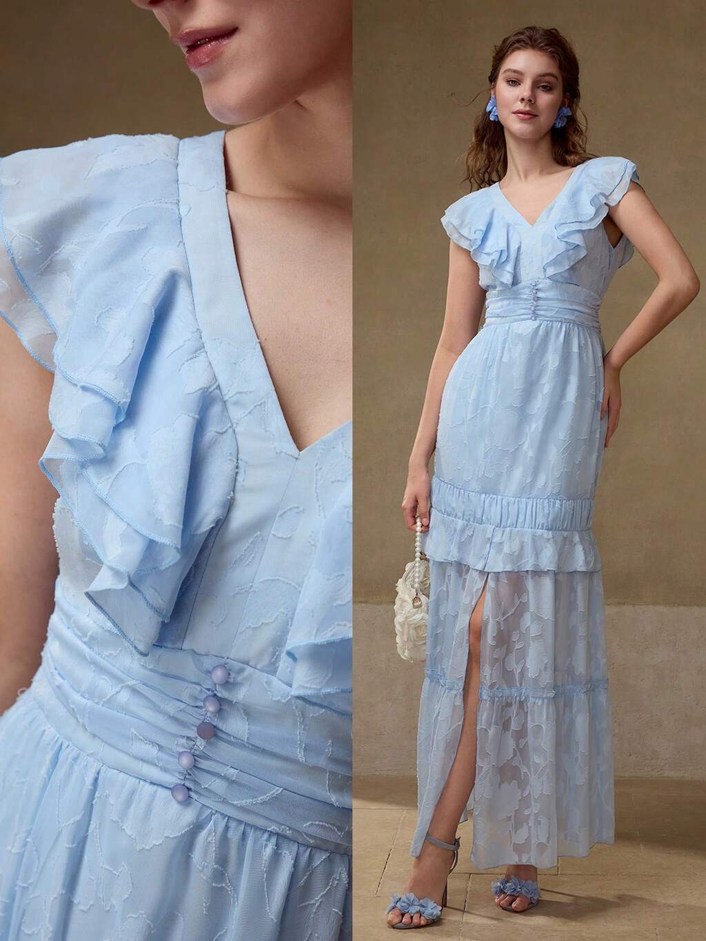 Vestido de manga acampanada con lentejuelas contrastantes y escote en V