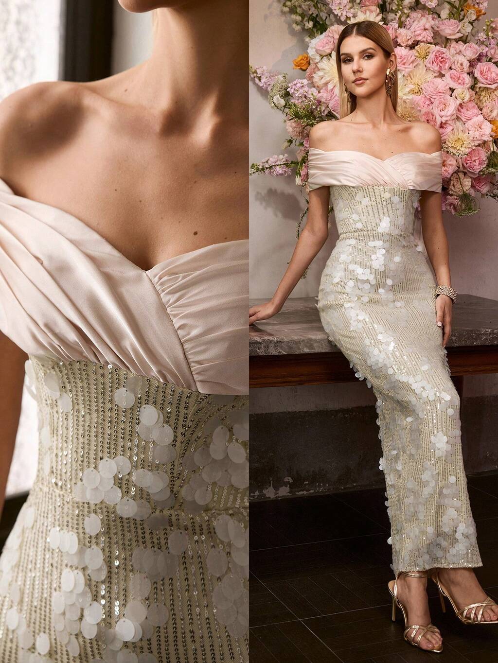 Vestido de cóctel de dos tonos con hombros descubiertos, volantes en capas, hebilla, cinturón y dobladillo de cola de sirena con lentejuelas