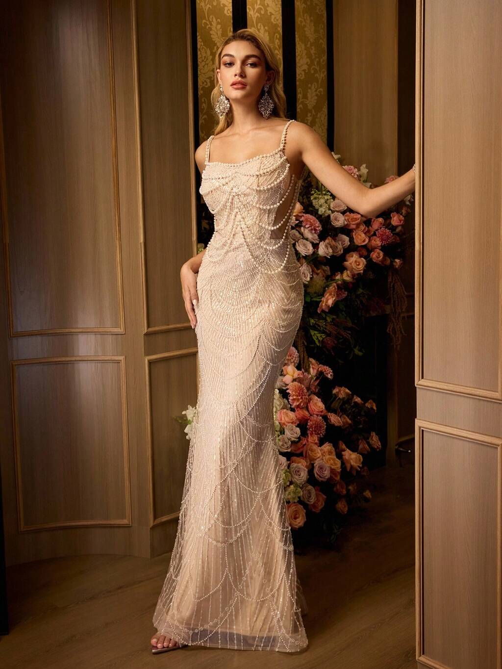 MOTF Soiréza ELEGANTE VESTIDO DE NOCHE LARGO DE COLA DE SIRENA CON CUENTAS, CADENAS DE PERLAS Y LAZADA TRASERA - PERFECTO PARA FIESTAS FORMALES Y BODAS