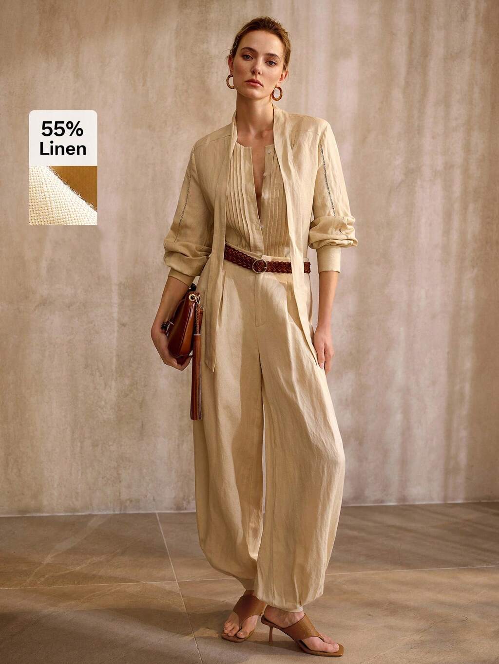 Pantalones de linón con estilo vintage y elegante, estilo urbano, para primavera/verano. Cinturón no incluido.