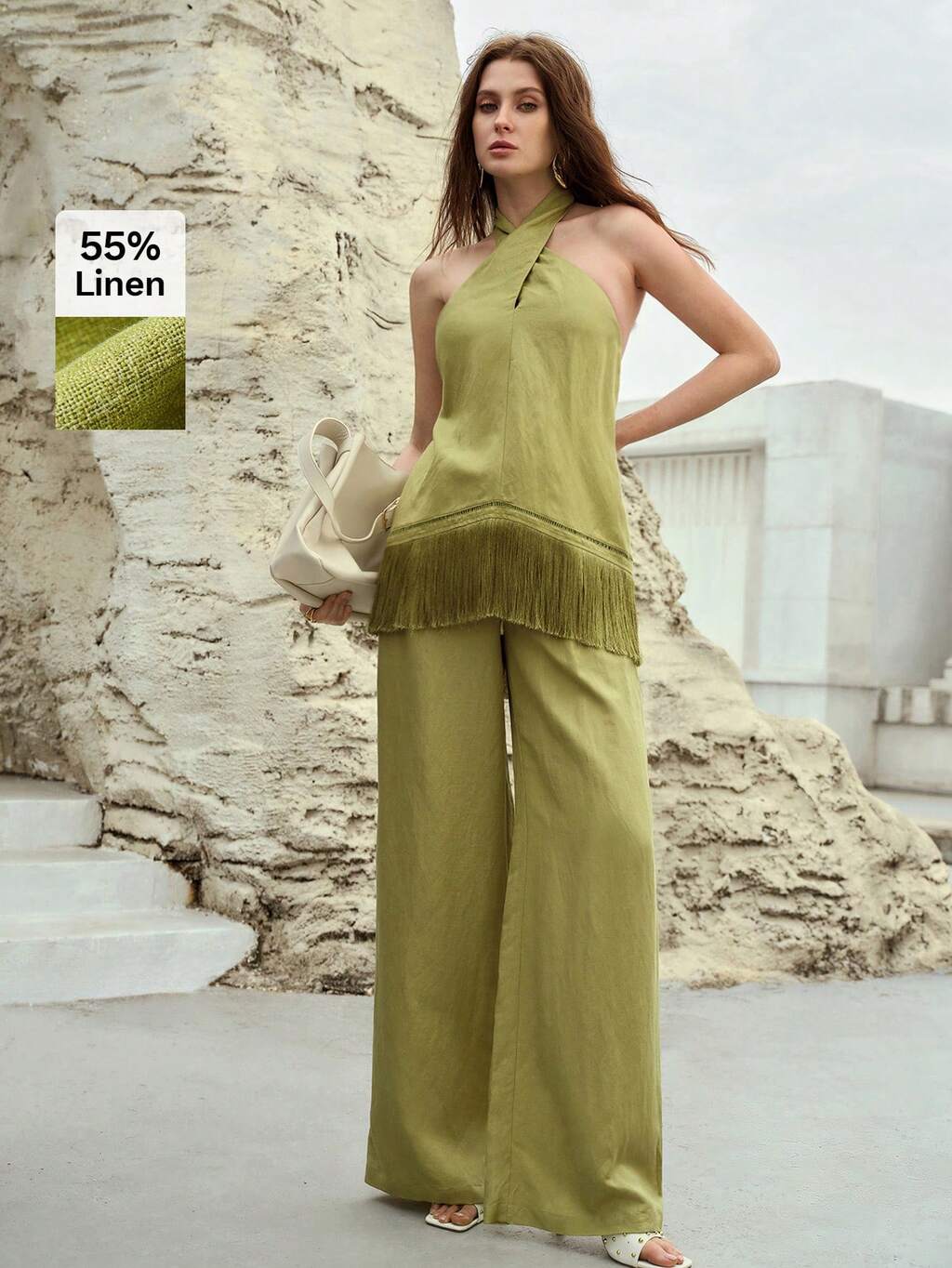 PANTALONES DE TRAJE CON CINTURA DE CORDÓN DE MEZCLA DE LINO, PRIMAVERA/VERANO
