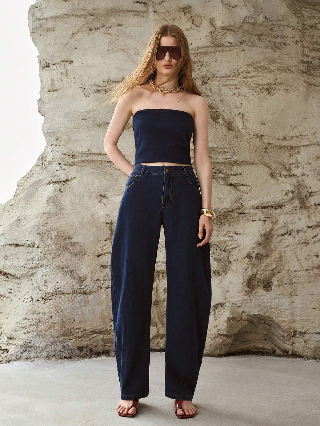 Vestido de mezclilla con escote halter, cuello de solapa, botones en la pechera y espalda descubierta
