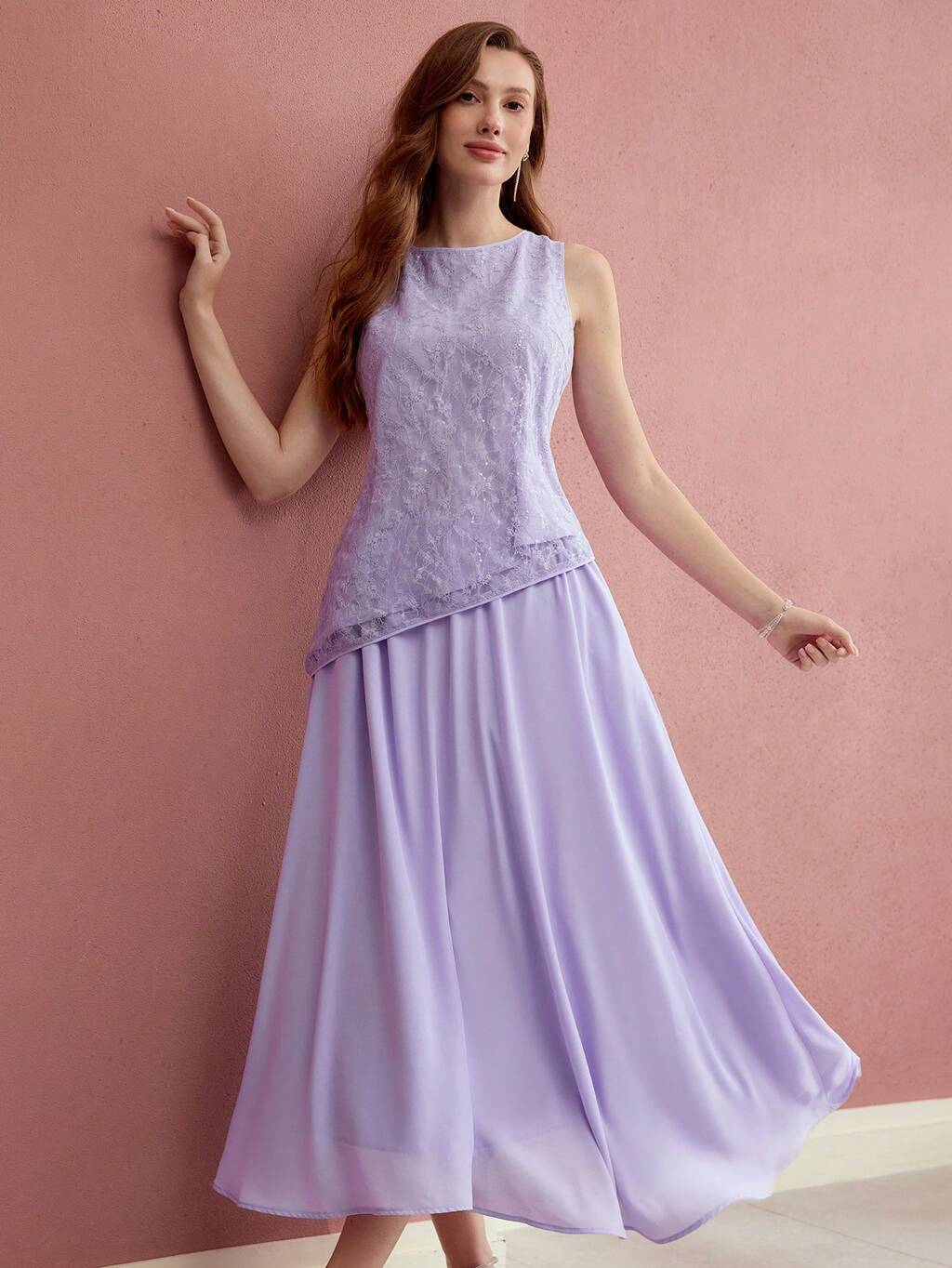 TOP CON BAJO ASIMÉTRICO DE ENCAJE CONTRASTANTE Y FALDA FLUIDA