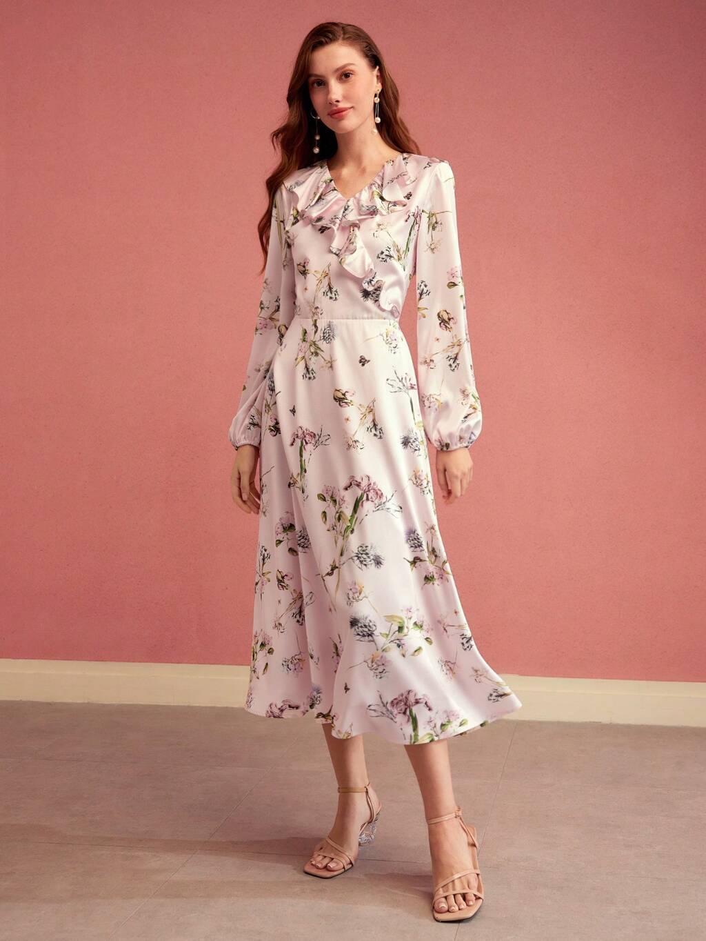 VESTIDO MIDI CON CUELLO EN V, VOLANTES Y LAZO, OUTFIT PARA EL DÍA DE SAN VALENTÍN