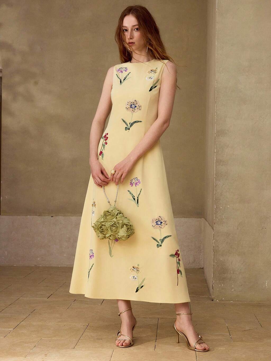 VESTIDO MIDI AMARILLO LIMÓN ELEGANTE CON BORDADO FLORAL 3D Y CUENTAS, SIN MANGAS