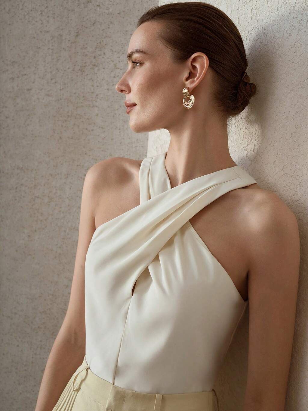 TOP ELEGANTE SIN MANGAS CON CUELLO HALTER DE CRUCE PARA MUJER EN COLOR ALBARICOQUE