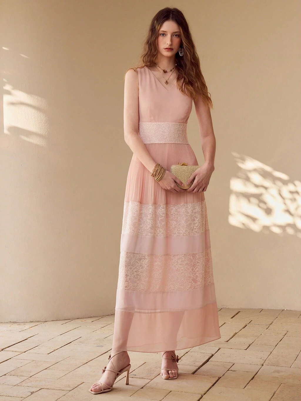 VESTIDO LARGO PARA MUJER CON VOLANTES ROMÁNTICOS, ENCAJE BORDADO Y CAPAS, PRIMAVERA/VERANO