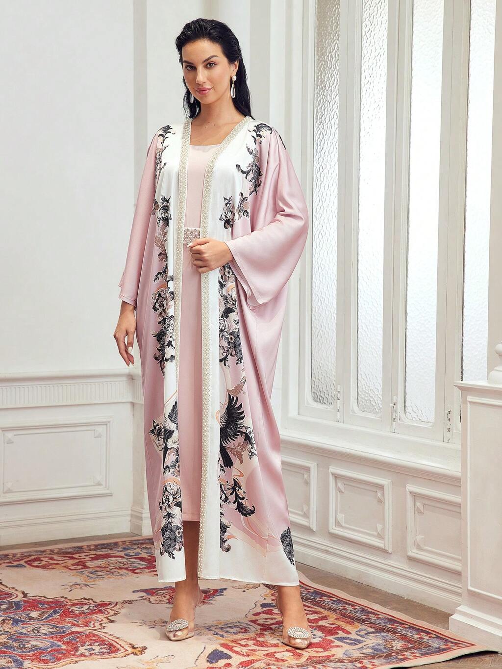 MANTEAU BLOC DE COULEUR IMPRIMÉ FLORAL À MANCHES CLOCHES & ROBE À OURLET ÉVASÉ DE TAILLE À PERLES FAUSSES