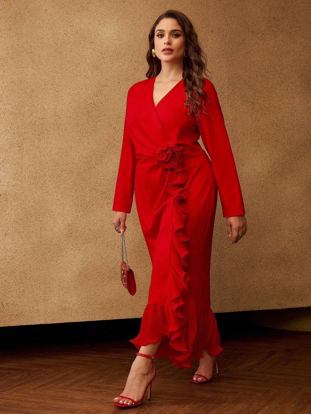 ROBE À MANCHES LONGUES AVEC VOLANTS FLORAUX 3D DE STYLE ENVELOPPANT, POUR FÊTE EN AUTOMNE/HIVER