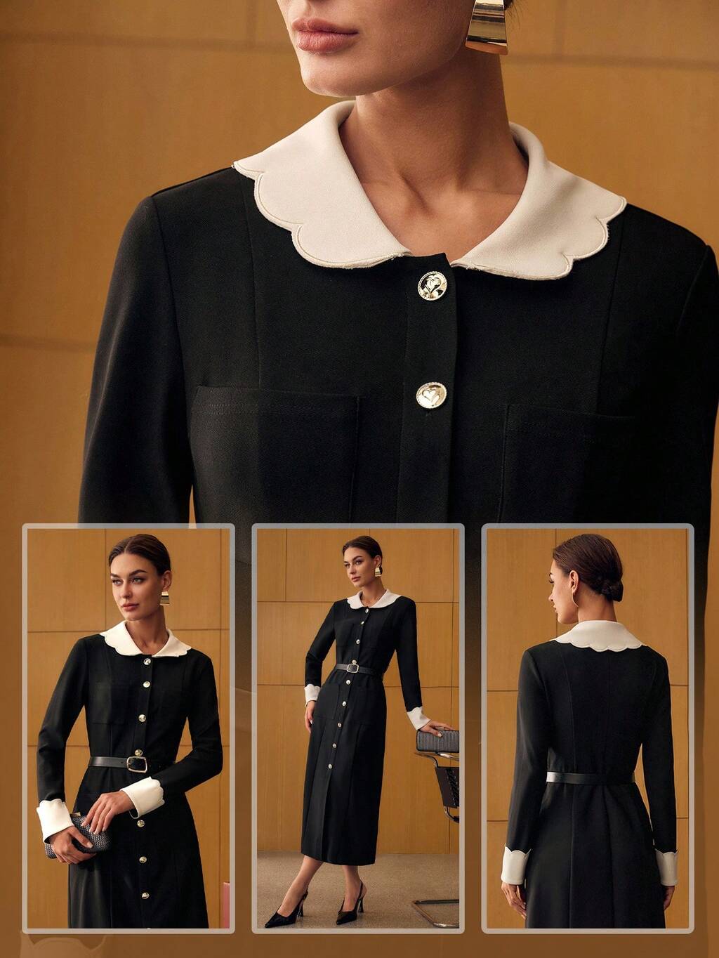 ROBE AJUSTÉE À LA TAILLE AVEC COL EN V FRONCÉ ET SEQUINS CONTRASTÉS, AUTOMNE/HIVER