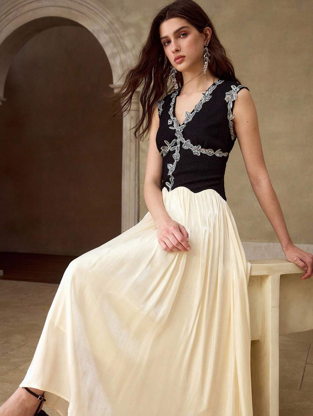 ROBE SANS MANCHES À TAILLE CINTRÉE AVEC DRAPÉ AUX ÉPAULES EN DENTELLE CONTRASTÉE