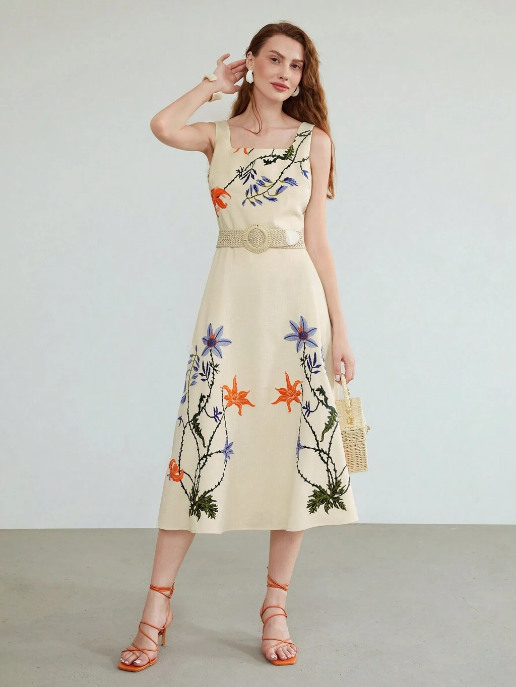 ROBE LONGUE FEMME EN LIN AVEC DÉCORATION blocs de couleurs, COL CARRÉ, COUPE ÉVASÉE, PRINTEMPS/ÉTÉ