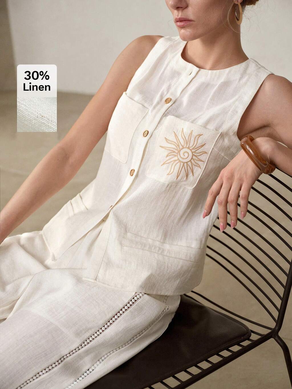 Ensemble Top sans manches avec boutons brodés et pantalon large pour vacances