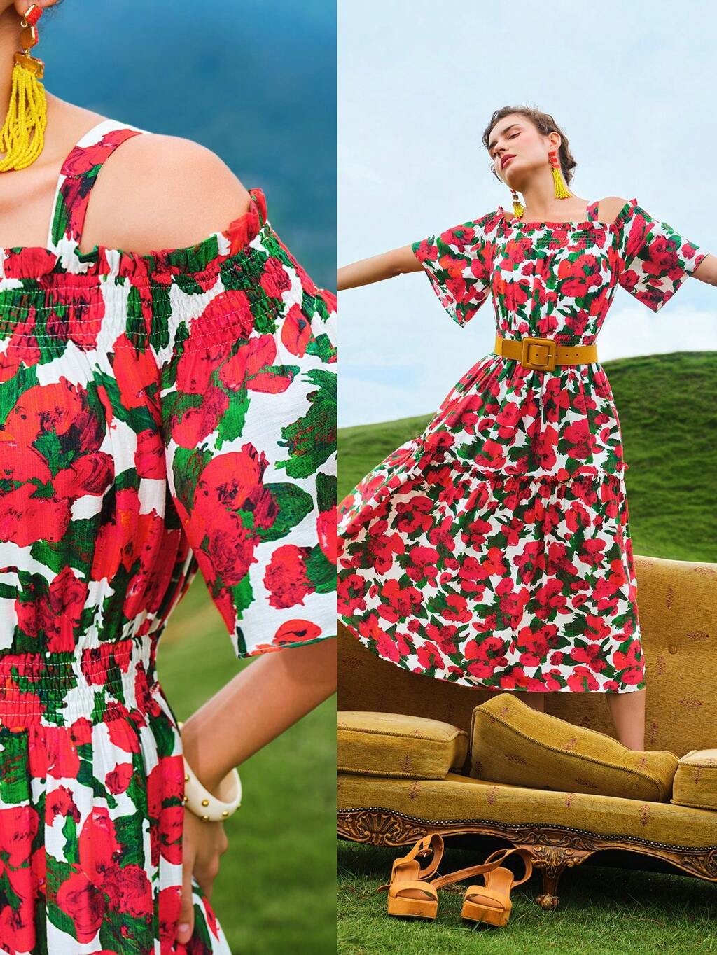 MOTF X MARIA-VICTORIA CHECA ROBE D'ÉPAULES DÉCOUVERTES À IMPRIMÉ FLORAL TOTAL ET MANCHES À VOLANTS