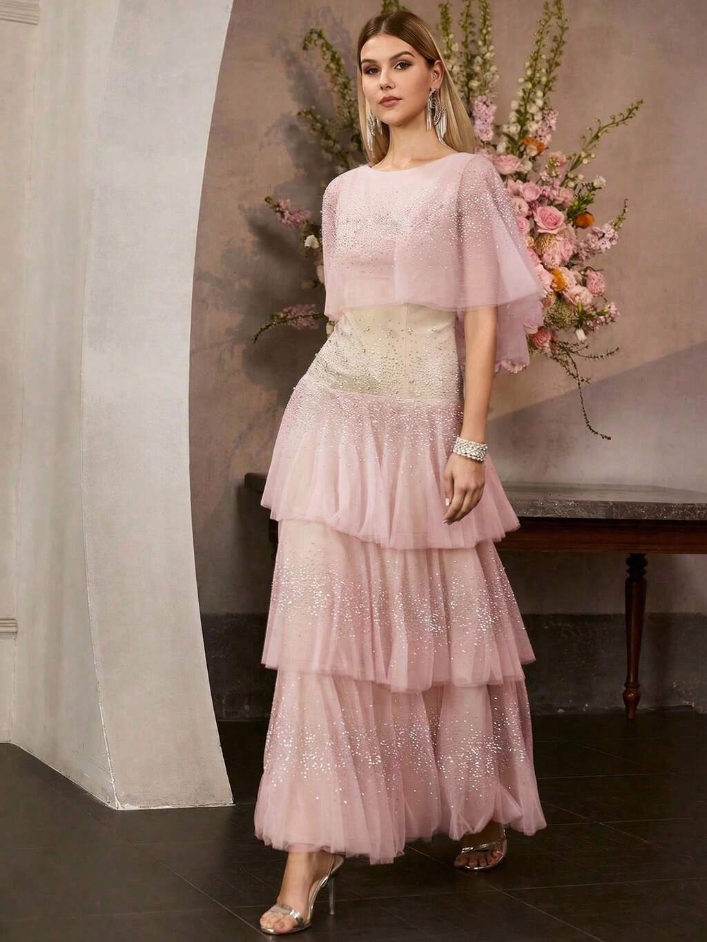 ROBE DE SOIRÉE FORMELLE FEMME NOUVELLE EN MAILLE PERLÉE MULTICOUCHE, ROBE MAXI ÉTHÉRÉE À VOLANTS TRANSPARENTS, ROBE DE SOIRÉE DE GALA Top DE GAMME POUR DÉFILÉ