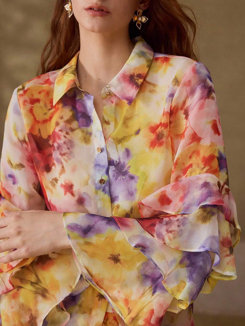 BLOUSE ROMANTIQUE ET ÉLÉGANTE POUR FEMMES À MANCHES ÉVASÉES SUPERPOSÉES AVEC IMPRIMÉ FLORAL TOUT-ALLER, PRINTEMPS/ÉTÉ