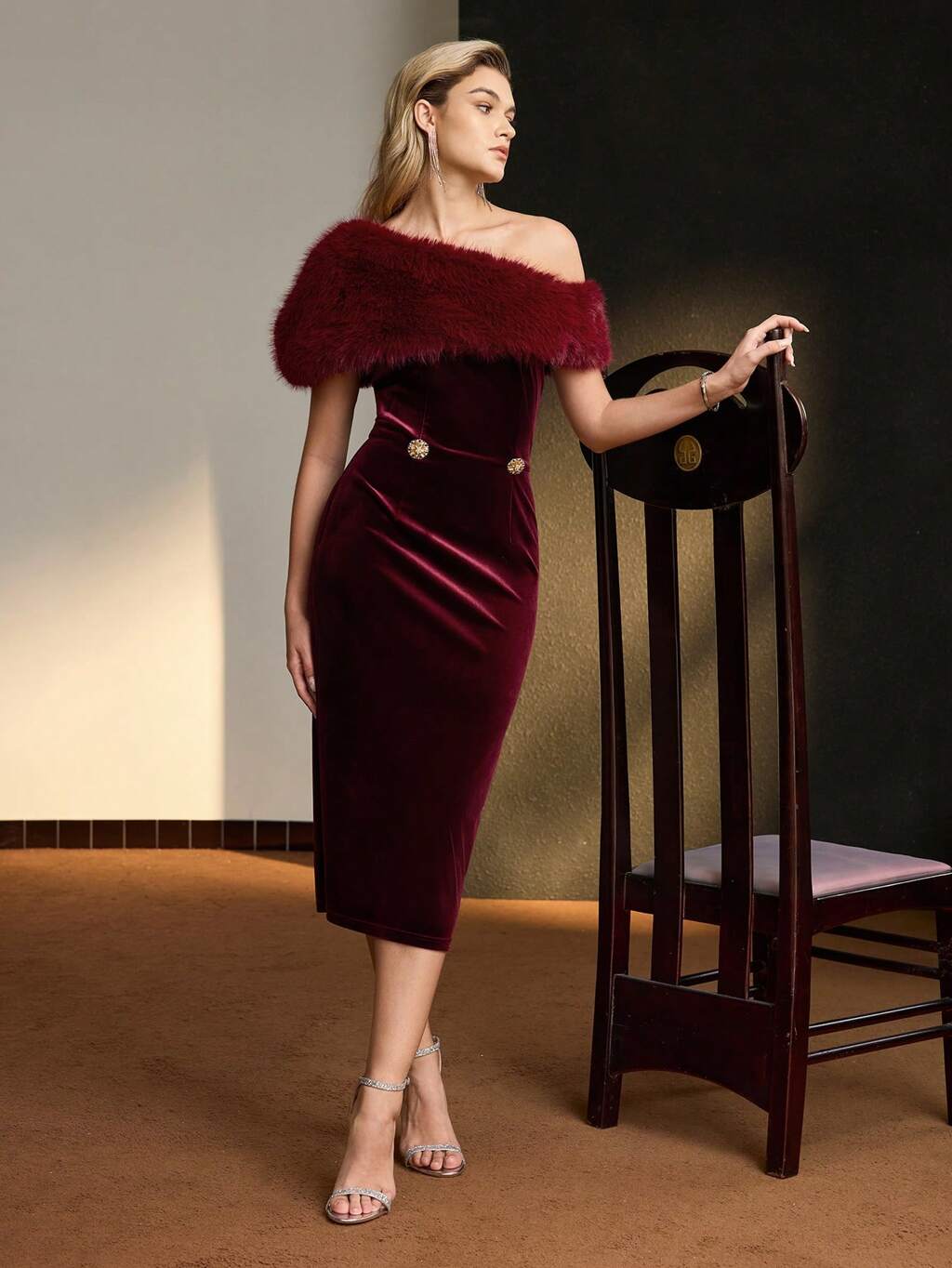 MOTF Soiréza Abito da cocktail aderente in velluto con pannello peloso e scollo asimmetrico