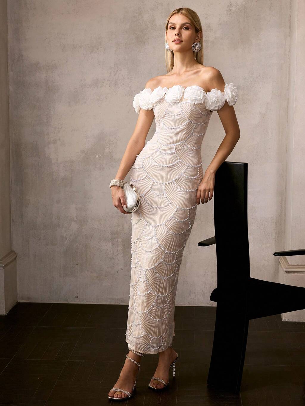 MOTF Soiréza Vestito da cocktail lungo senza cintura con scollo a V, dettagli a fiori in rilievo e orlo a sirena
