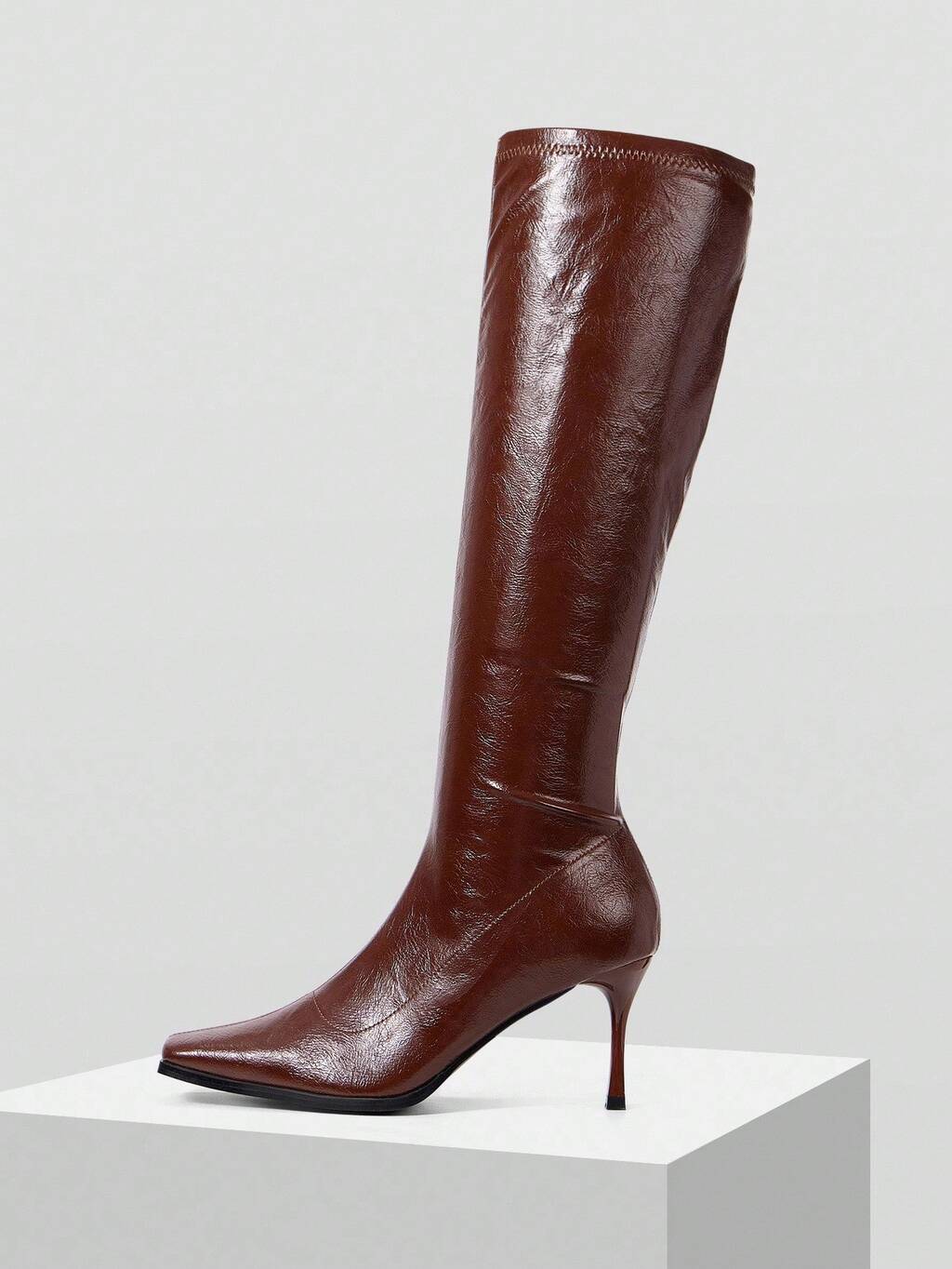 Stivali alti al ginocchio da donna con punta quadrata, cerniera laterale e tacco a spillo, colore marrone