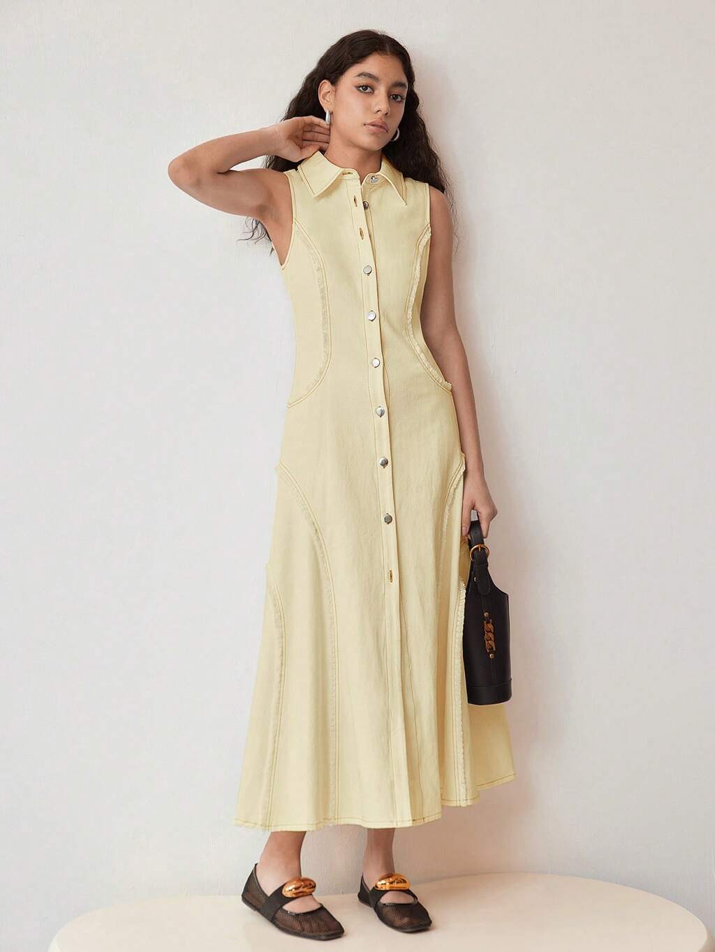 Abito midi in lino senza maniche con bordi a contrasto, classico ed elegante per l'ufficio, adatto per primavera/estate