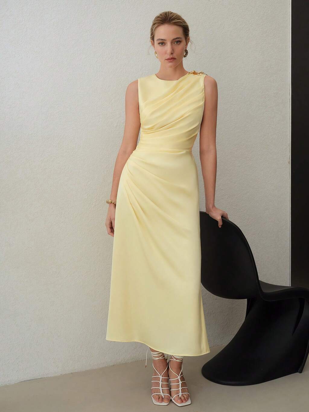 SHEIN x PRISCILA & JIMENA Elegante abito midi con pieghe e decorazione a farfalla, adatto per appuntamenti e uso quotidiano