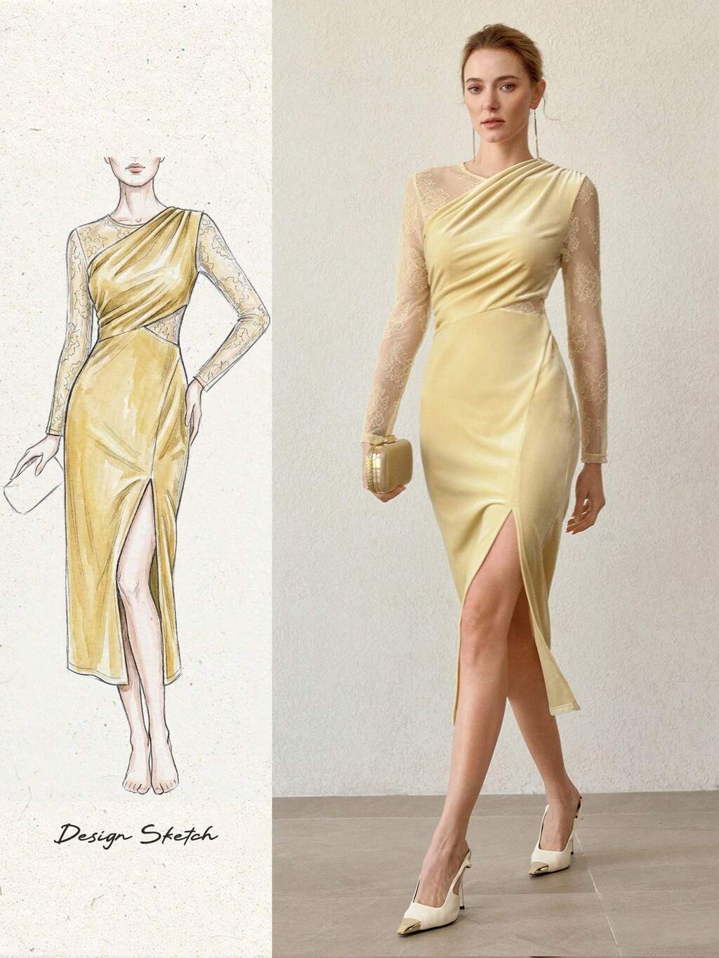 女性用ベルベット メッシュ レースパッチワーク フィットドレス