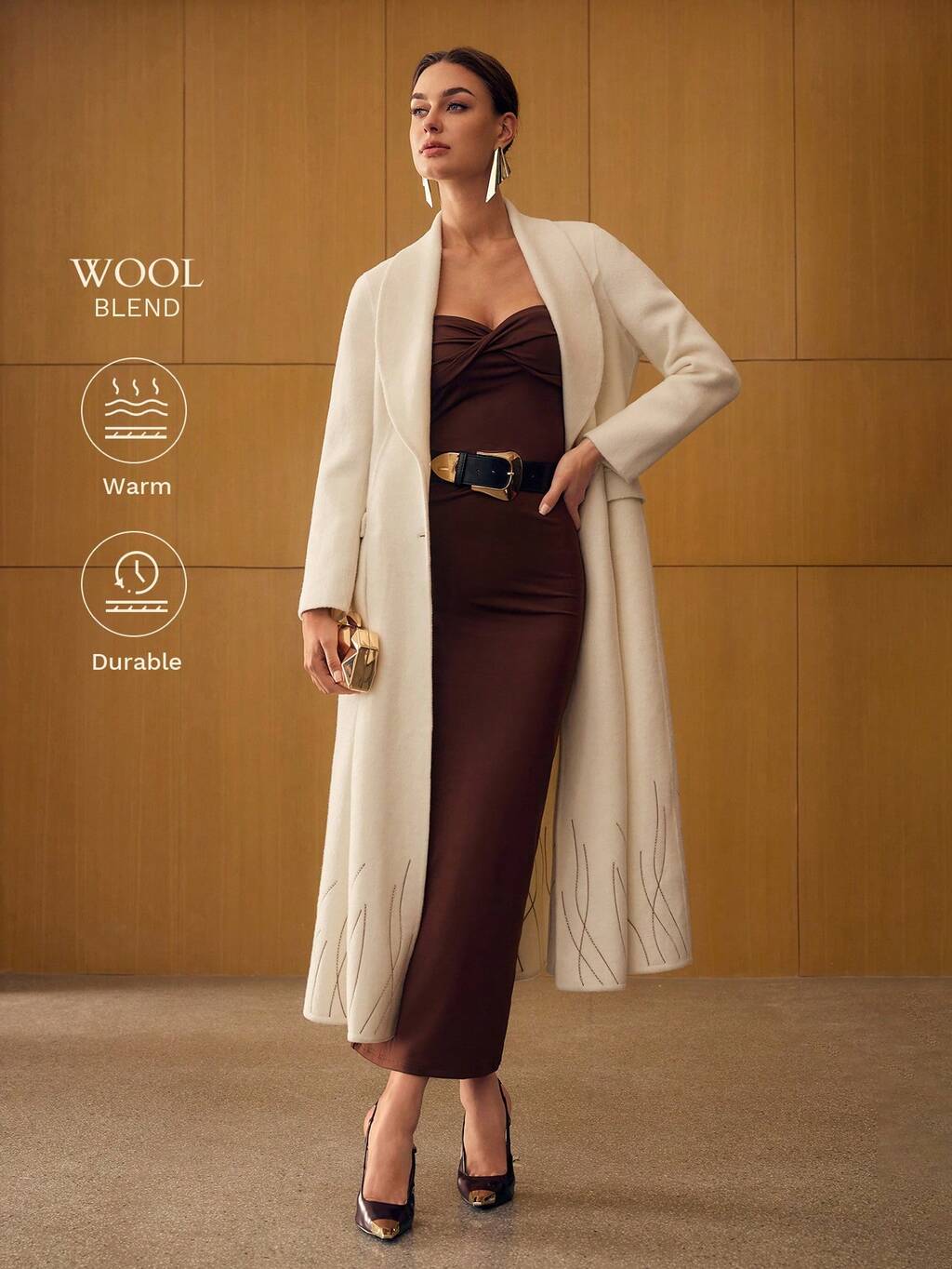 ウール コントラスト ファジートリム ベルト付きオーバーコート