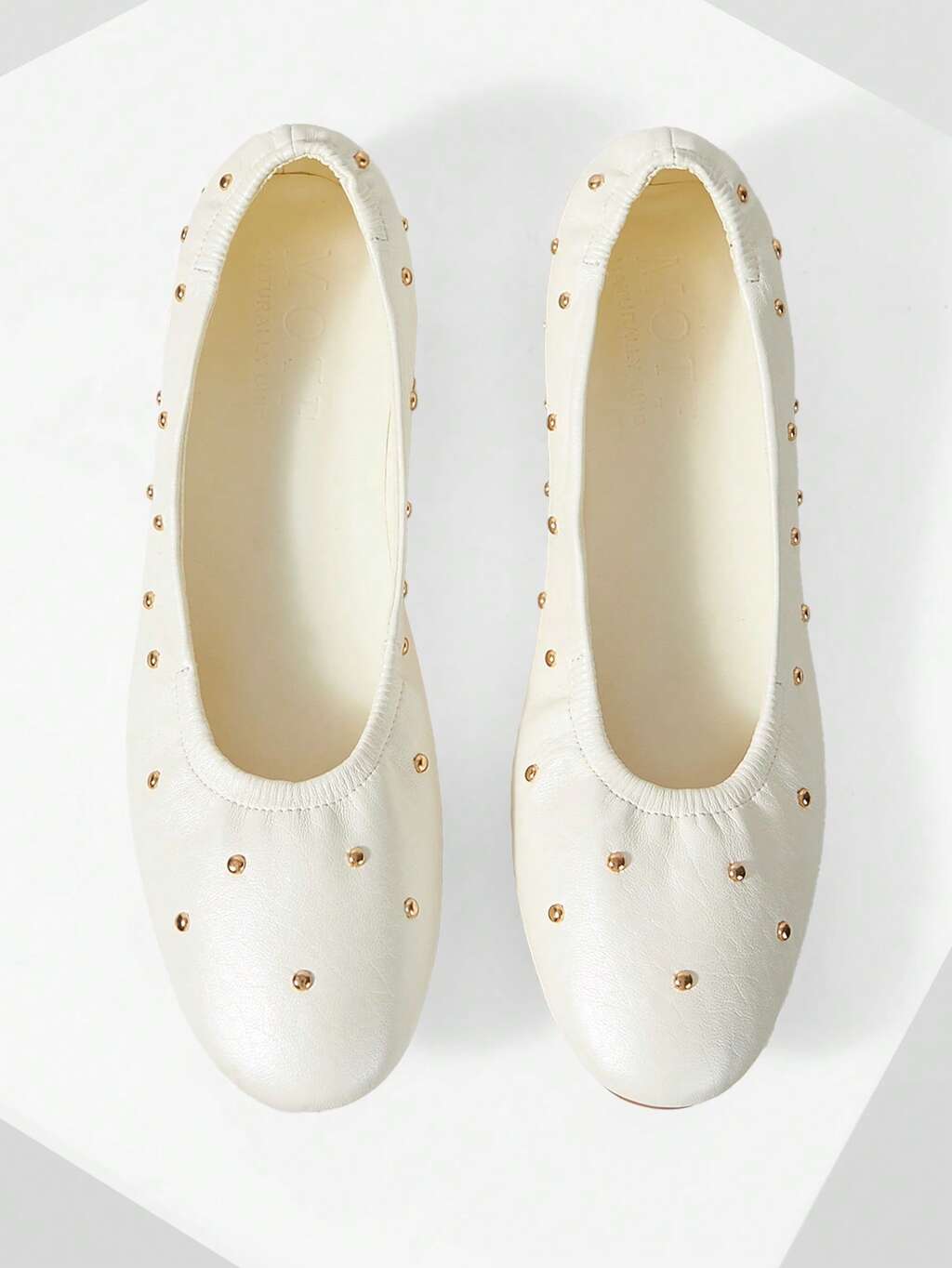 女性用シューズ フレンチレトロ 高品質PUレザー リベット プリーツ ラウンドトゥ フラットソール、ホワイト 多用途 エレガント スリッポン 軽量 滑り止め シンプルファッション ドゥドゥシューズ