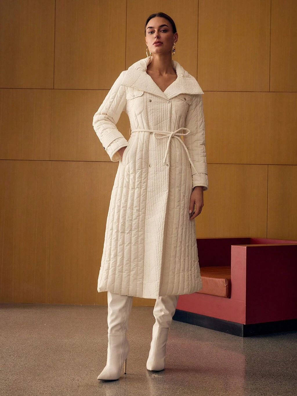 女性用エレガントなロングコート、ファー襟、プリーツパッチワーク、ベルト付き、秋冬
