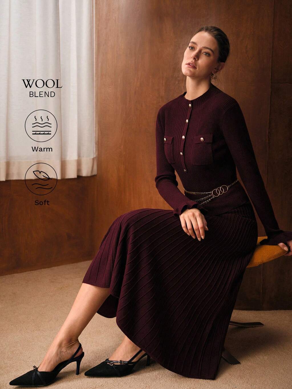 2枚セット ウールブレンド フィッテッドトップ & Aラインミディスカート セーターセット、秋冬