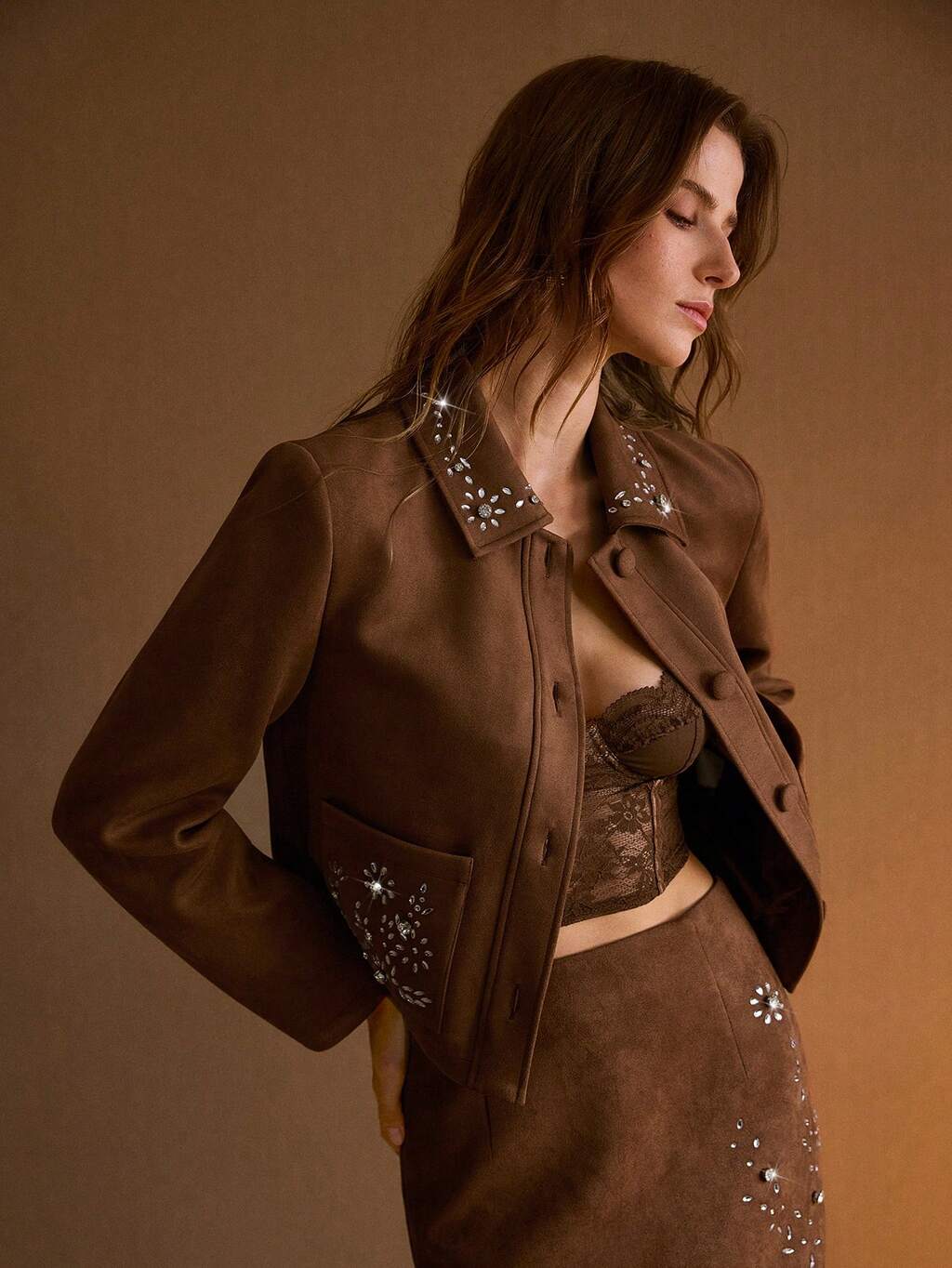 ベルベット ラインストーントリム ピークカラー ダブルブレスト プラケットブレザー