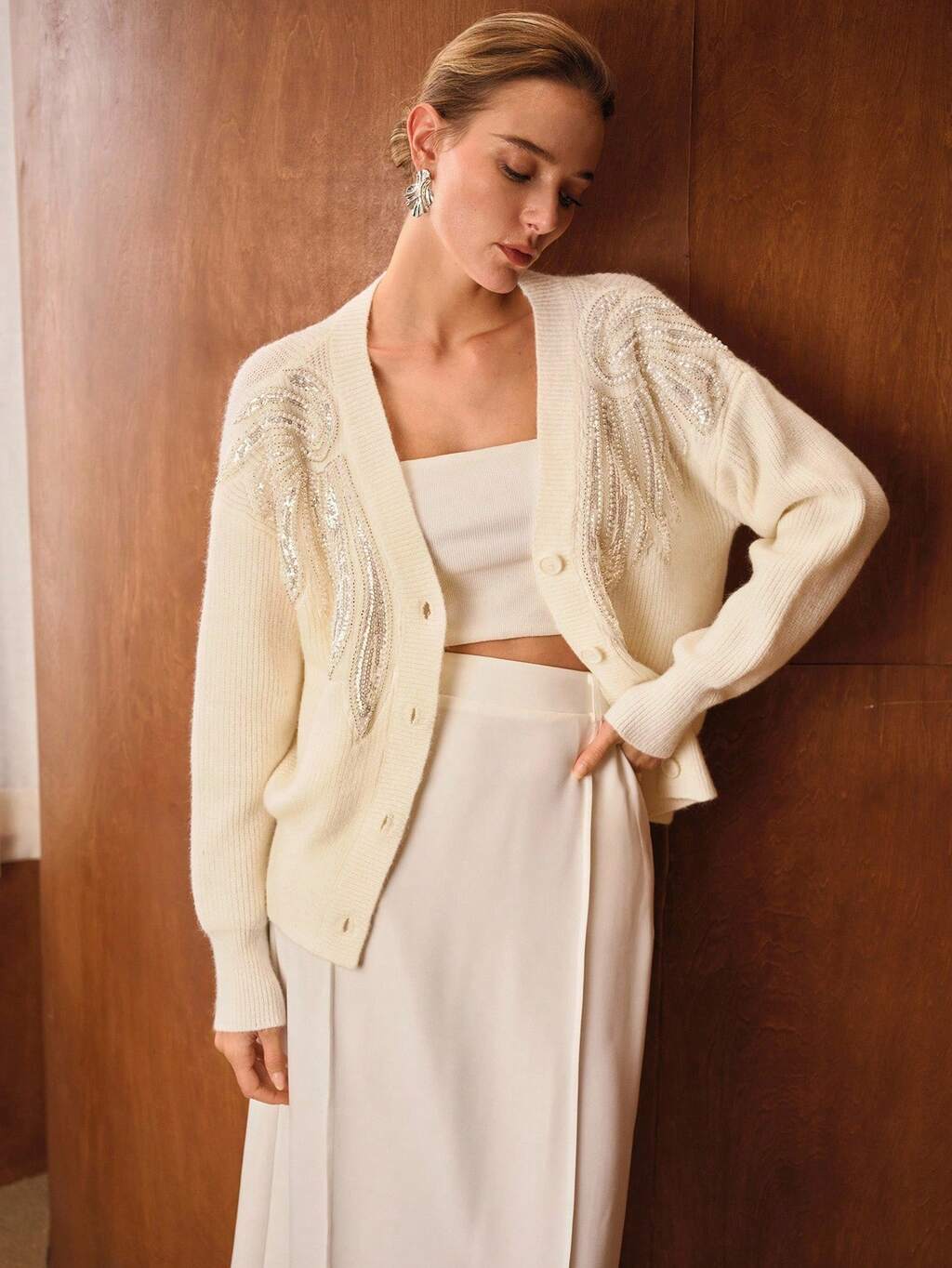 女性用Vネック長袖ビーズ付きニットカーディガン、秋冬