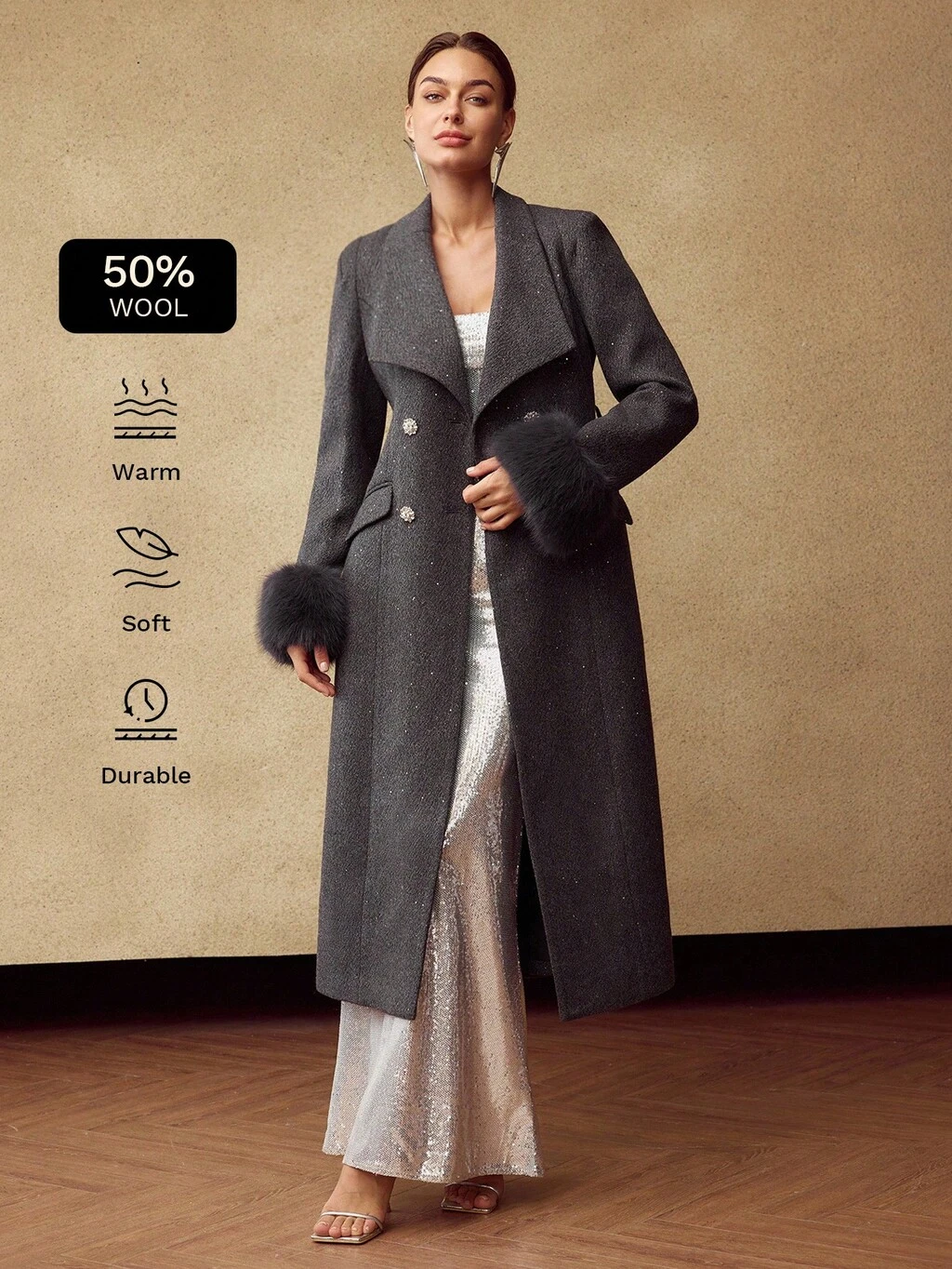 울 블렌드 라인스톤 인조 진주 트림 숄 칼라 퍼지 커프 벨트 오버코트, 가을 겨울