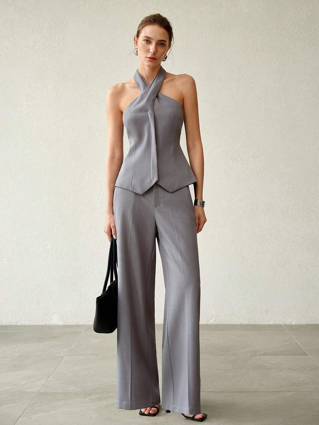 2개 여성 세트: 홀터 끈 없는 상의 + 슬림 플레어 레그 팬츠, 레트로 스타일