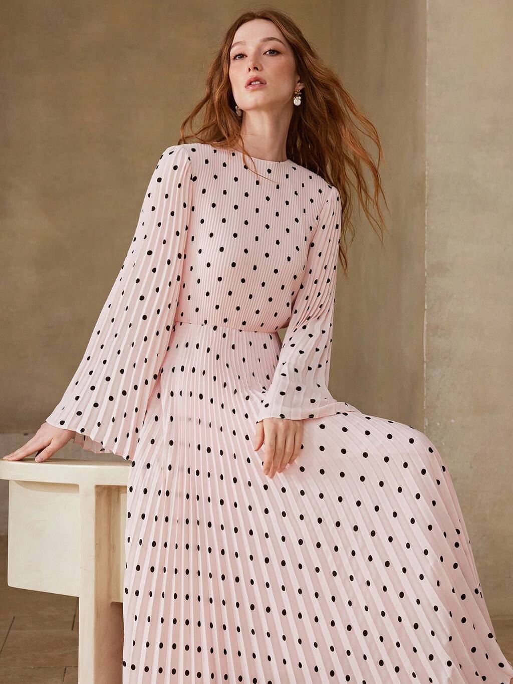 여성 폴카 도트 프린트 플리츠 우아한 긴소매 드레스, 봄/여름에 적합