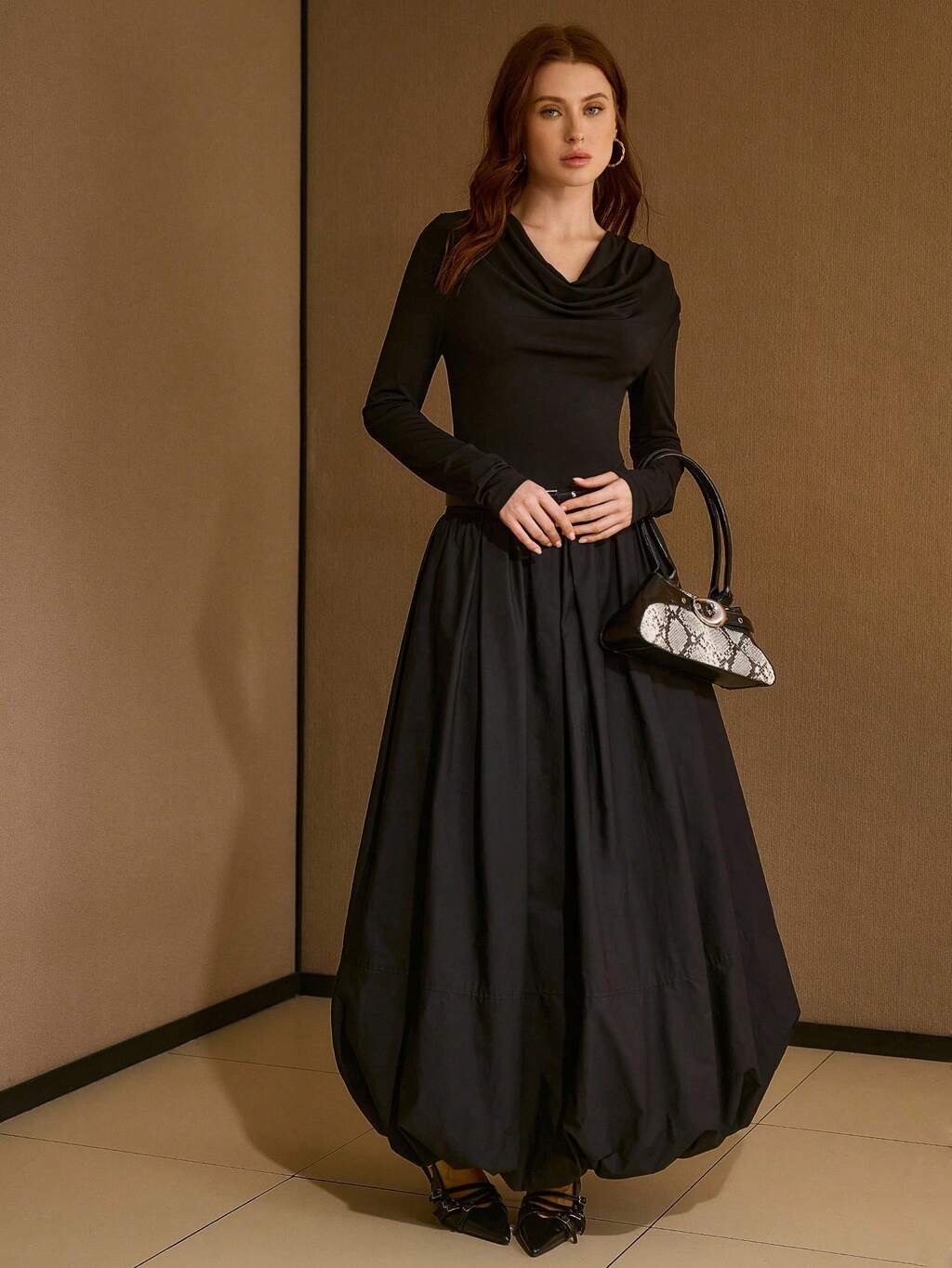 여성용 카울넥 우븐 긴소매 퍼프볼 헴 드레스