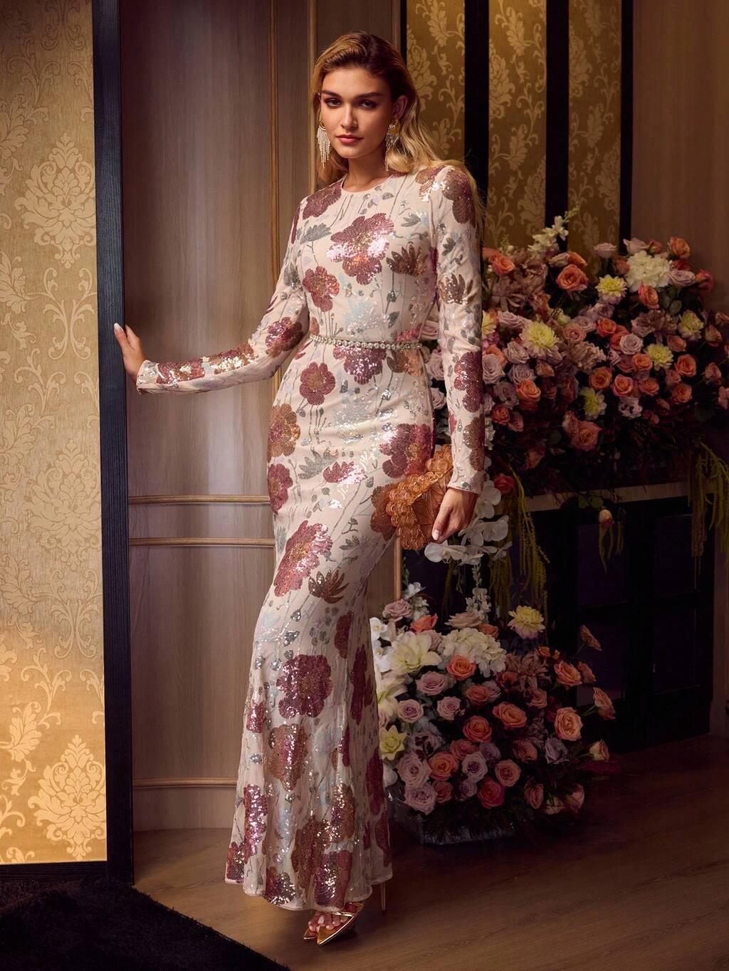 MOTF Soiréza 러플 디테일 자수 플로럴 콘트라스트 스팽글 칵테일 드레스