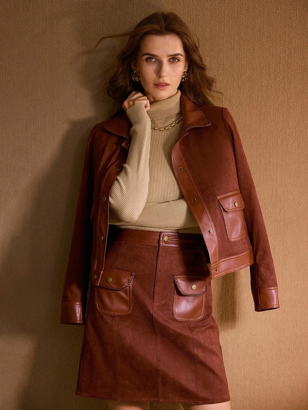 스웨이드 PU 가죽 패널 플랩 포켓 스커트