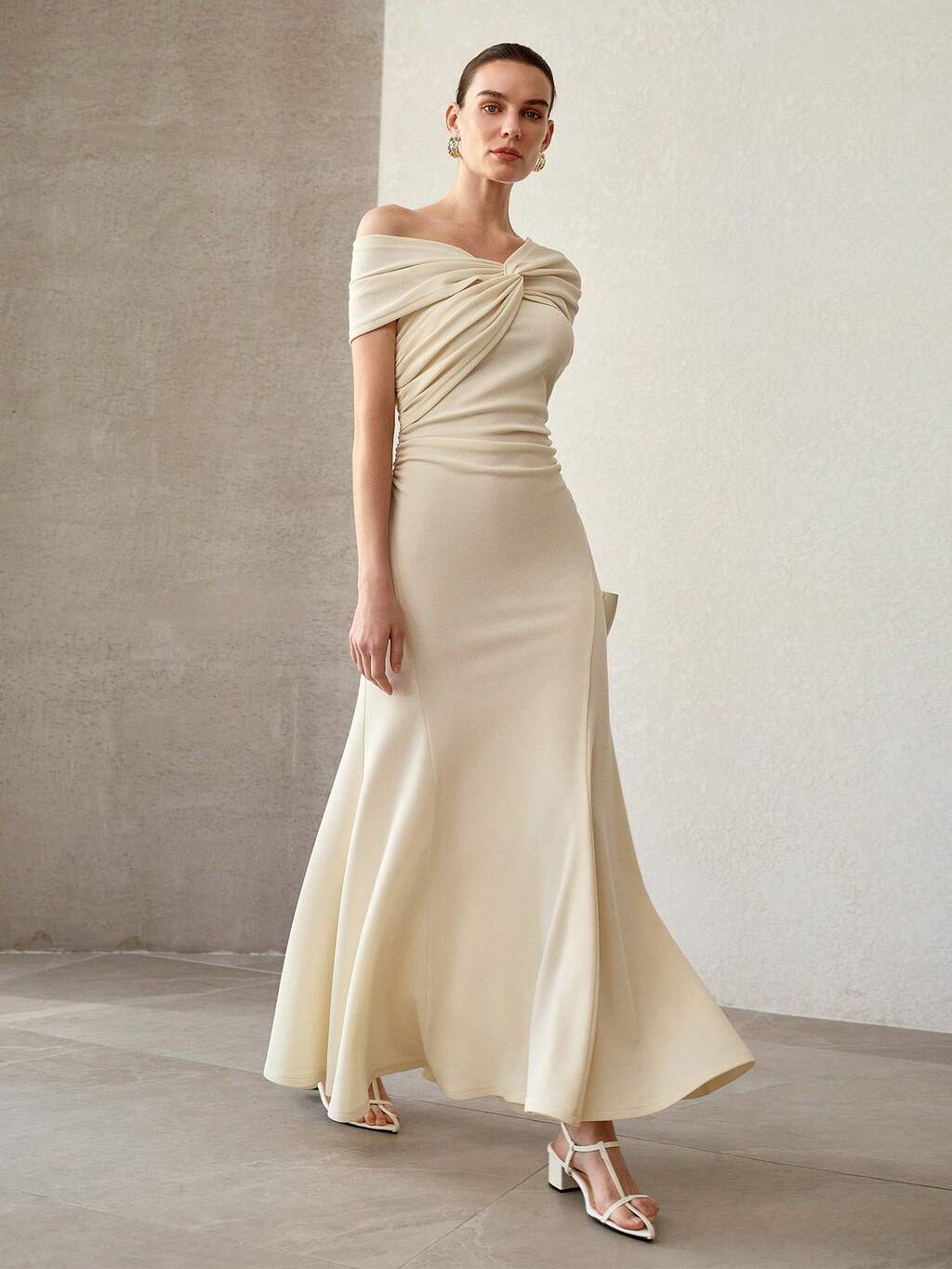 여성 니트 비대칭 숄더 러치드 맥시 드레스 허리 조임