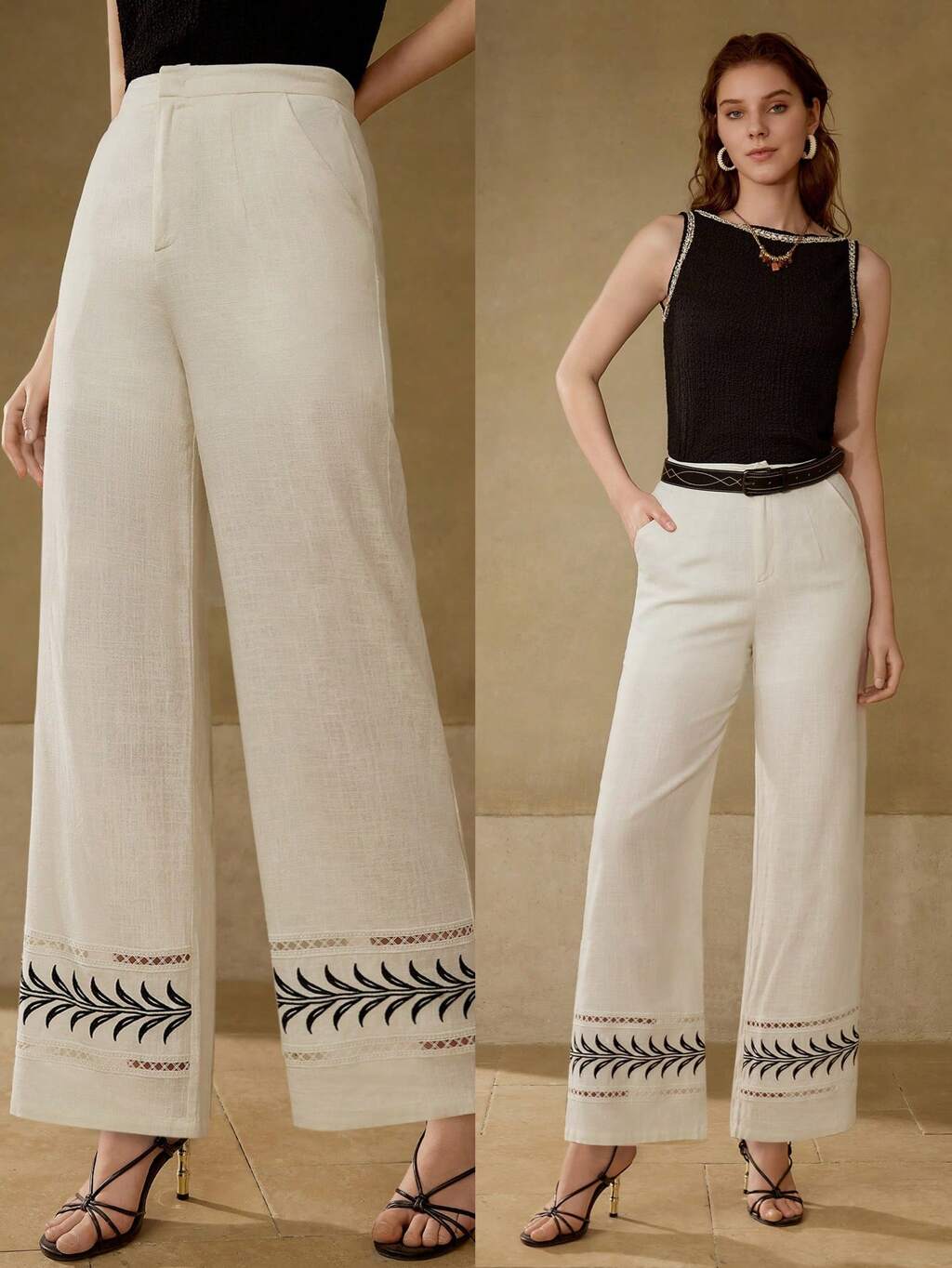 CONTRAST LACE EMBROIDERED WIDE LEG PANTS