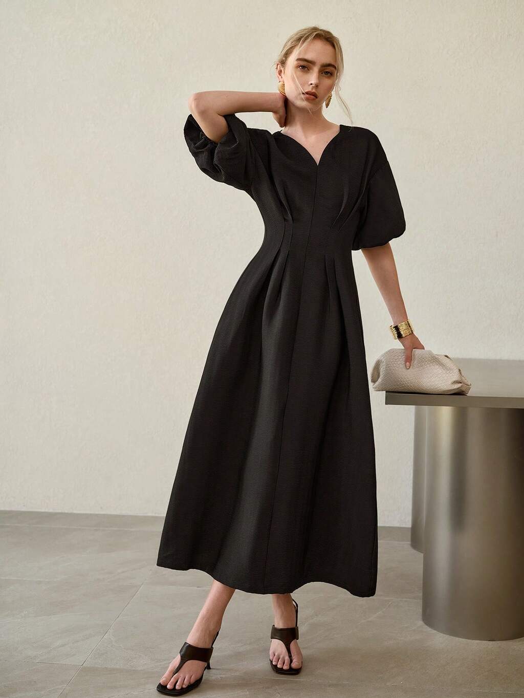 SWEETHEART NECK CINCHED WAIST LANTERN SLEEVE A-LINE MID-LENGTH DRESS, VERSATILE FOR EVERYDAY WEAR