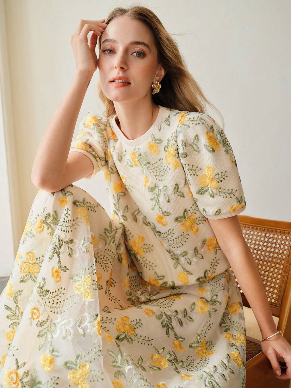 CONTRAST MESH FLORAL EMBROIDERY PUFF SLEEVE KNIT TOP, SHORT SLEEVES,SPRING/SUMMER