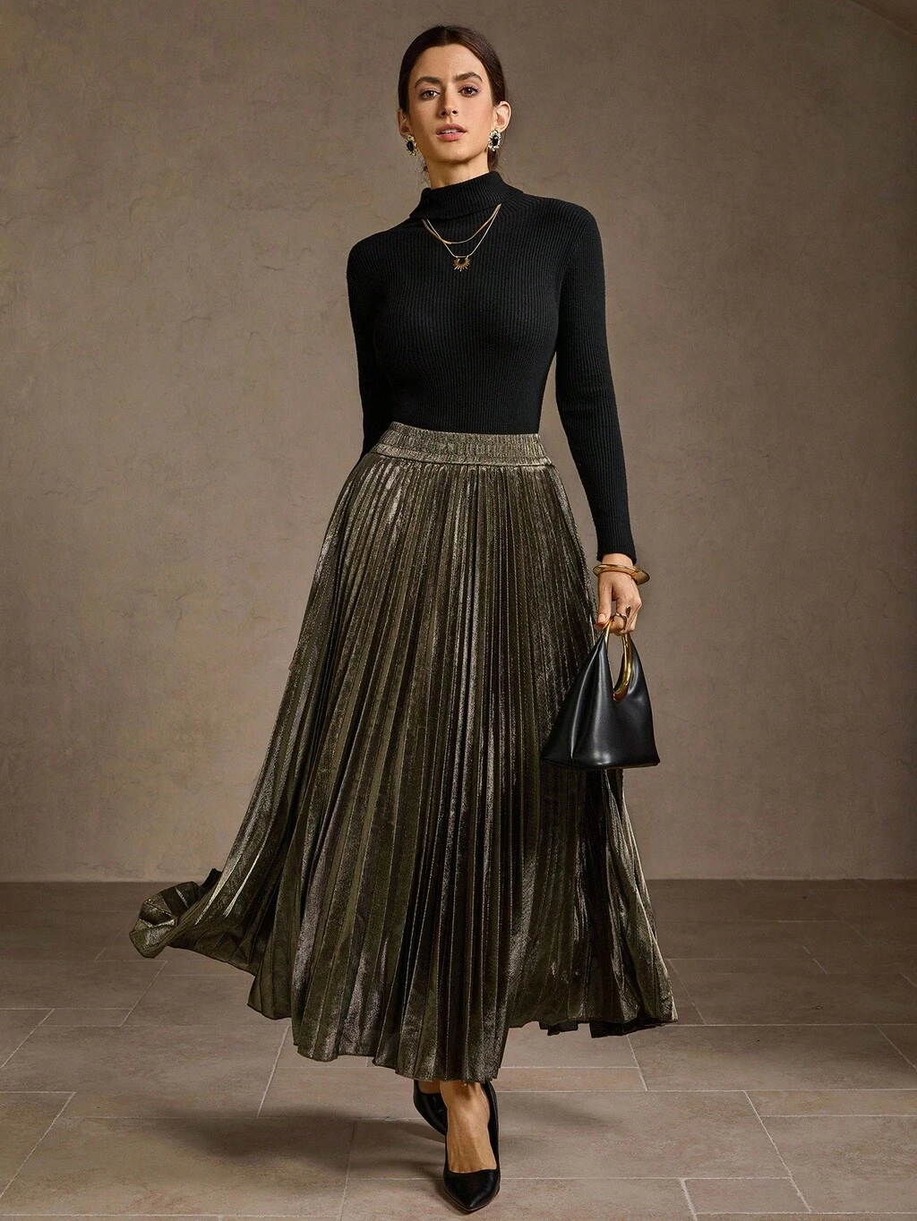 WOMEN'S VINTAGE METAL PLEATED ELASTIC HIGH WAIST A-LINE SKIRT