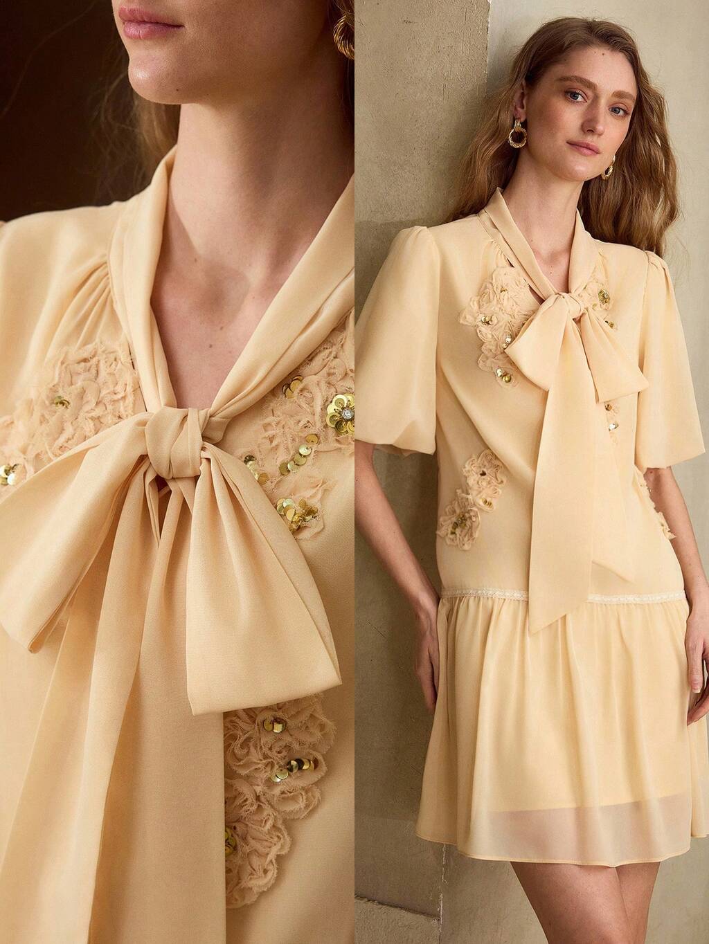 TIE NECK CONTRAST SEQUIN DETAIL FLUTTER SLEEVE SMOCK SHORT DRESS