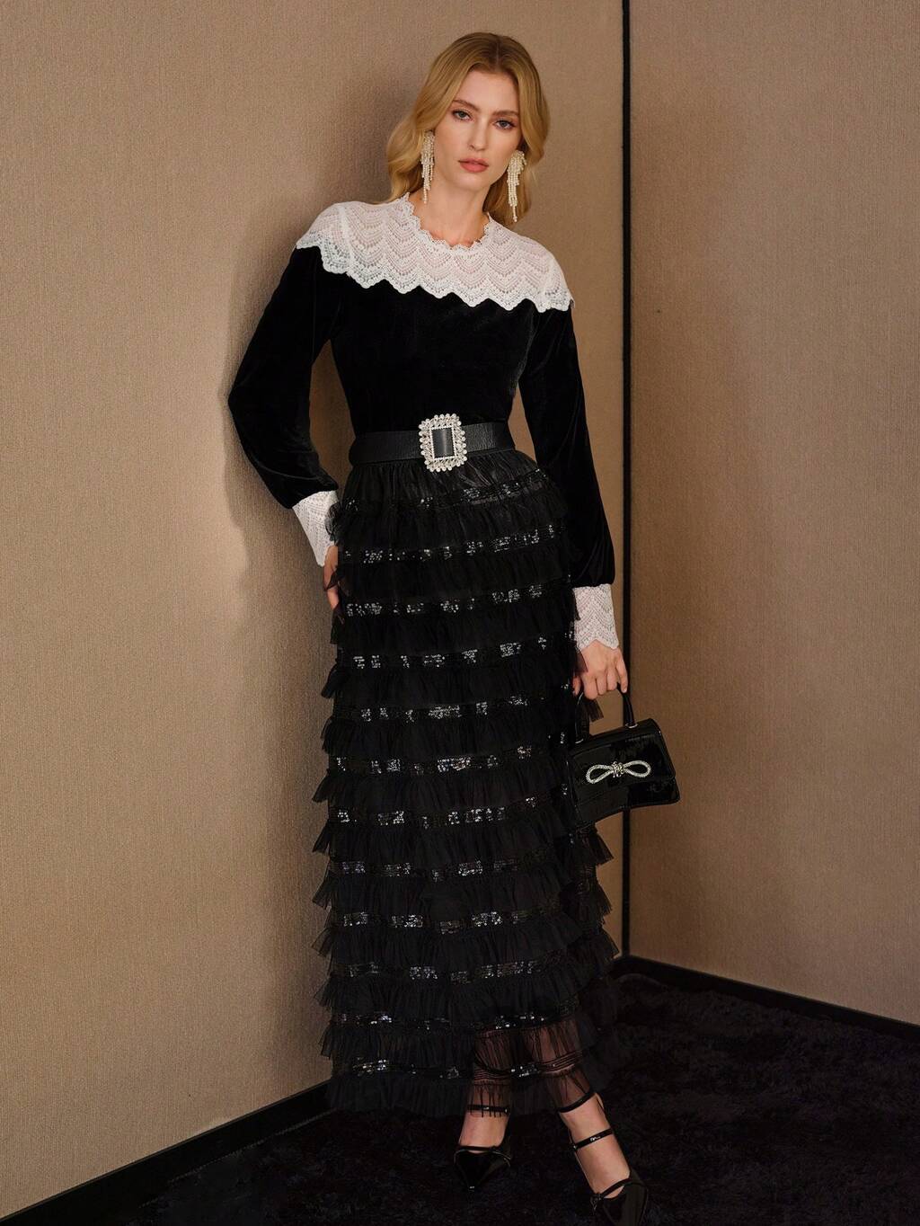 VELVET CONTRAST LACE YOKE BLOUSE