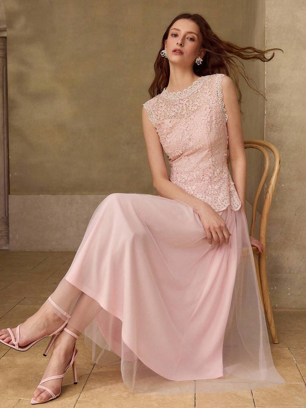 SUMMER DESIGN MESH PATCHWORK SLEEVELESS CONTRAST GUIPURE LACE ELEGANT ELEGANT PLEATED DRESS FOR WOMEN