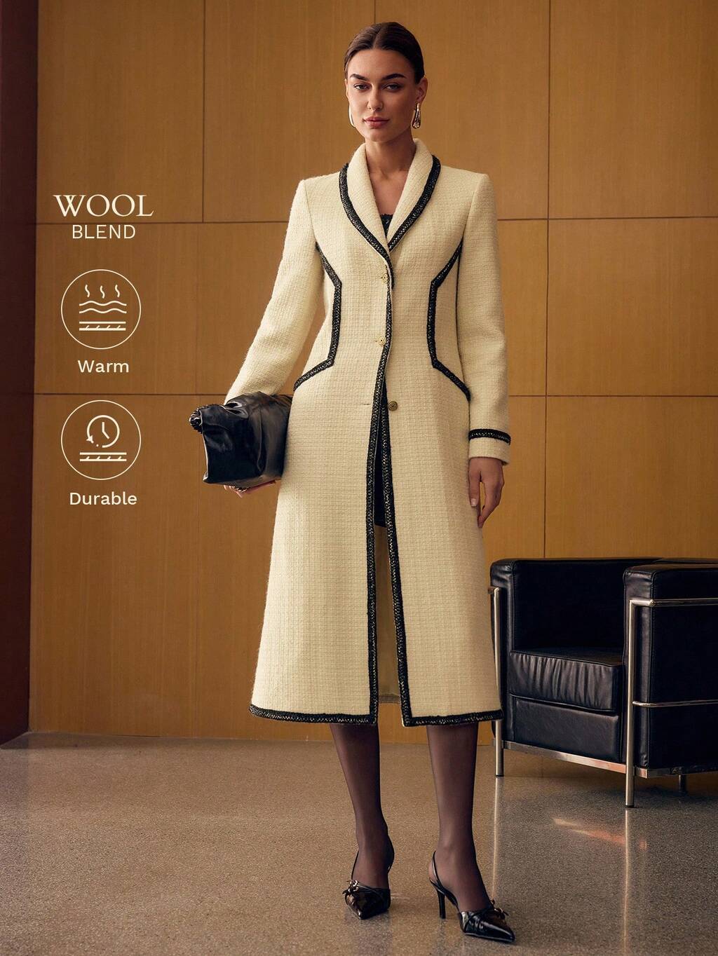 Wełniany, kontrastowy płaszcz z siateczki zapinany na guziki