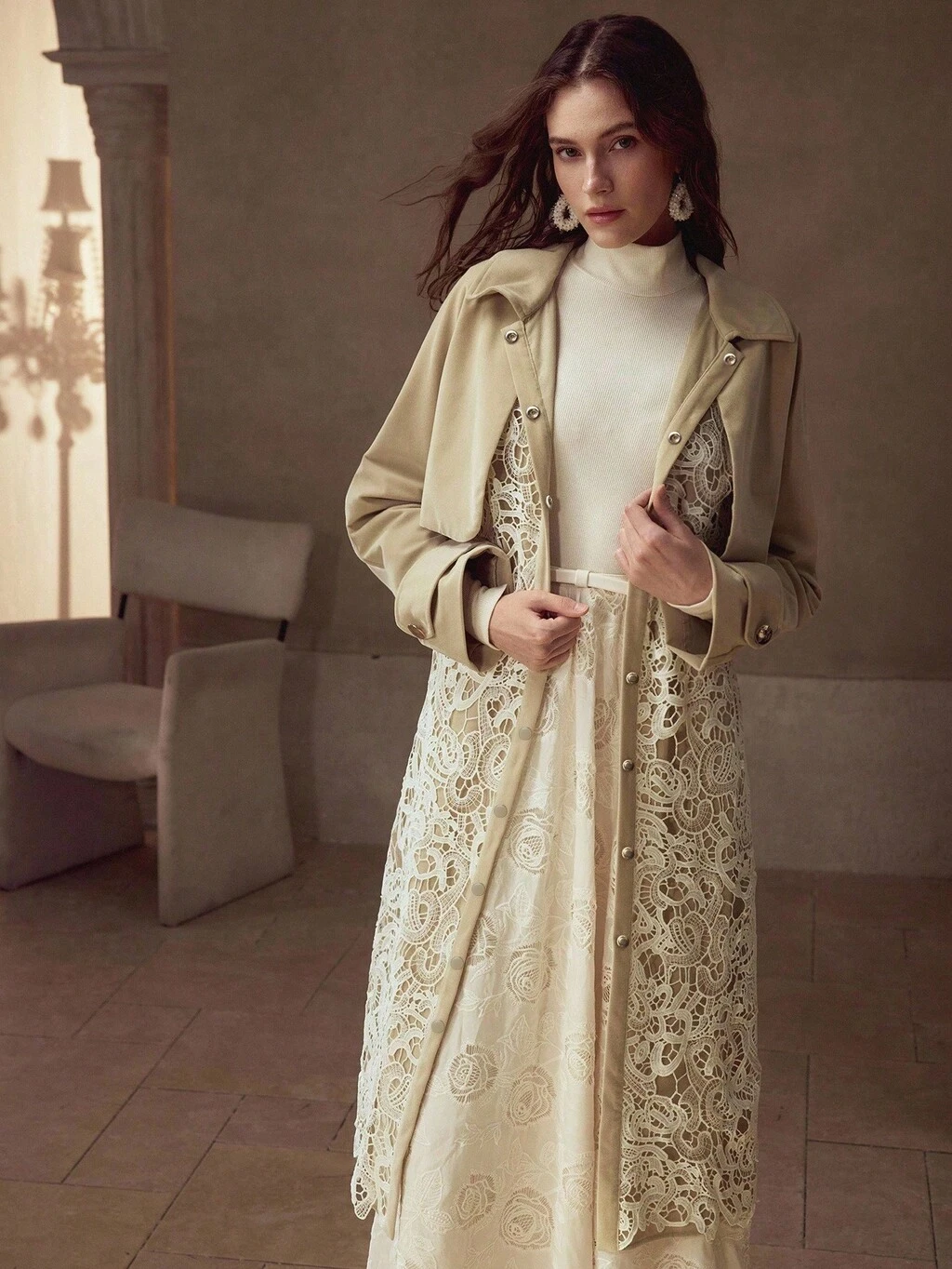 KONTRASTOWY PŁASZCZ TRENCH Z KORONKĄ GIPIURĄ I PASKIEM