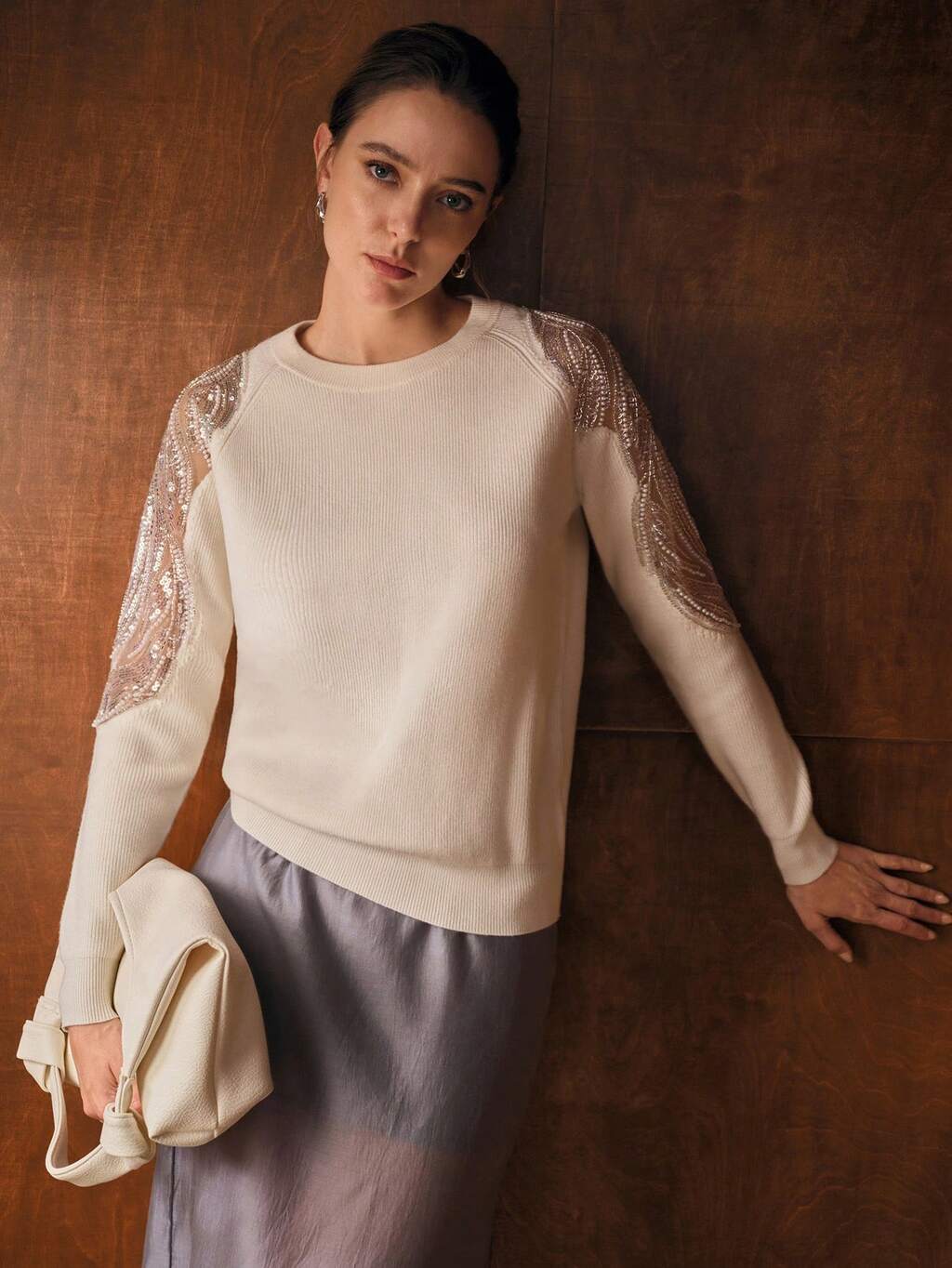Elegancki sweter dzianinowy z koralikami, okrągłym dekoltem i długim rękawem, jesień/zima